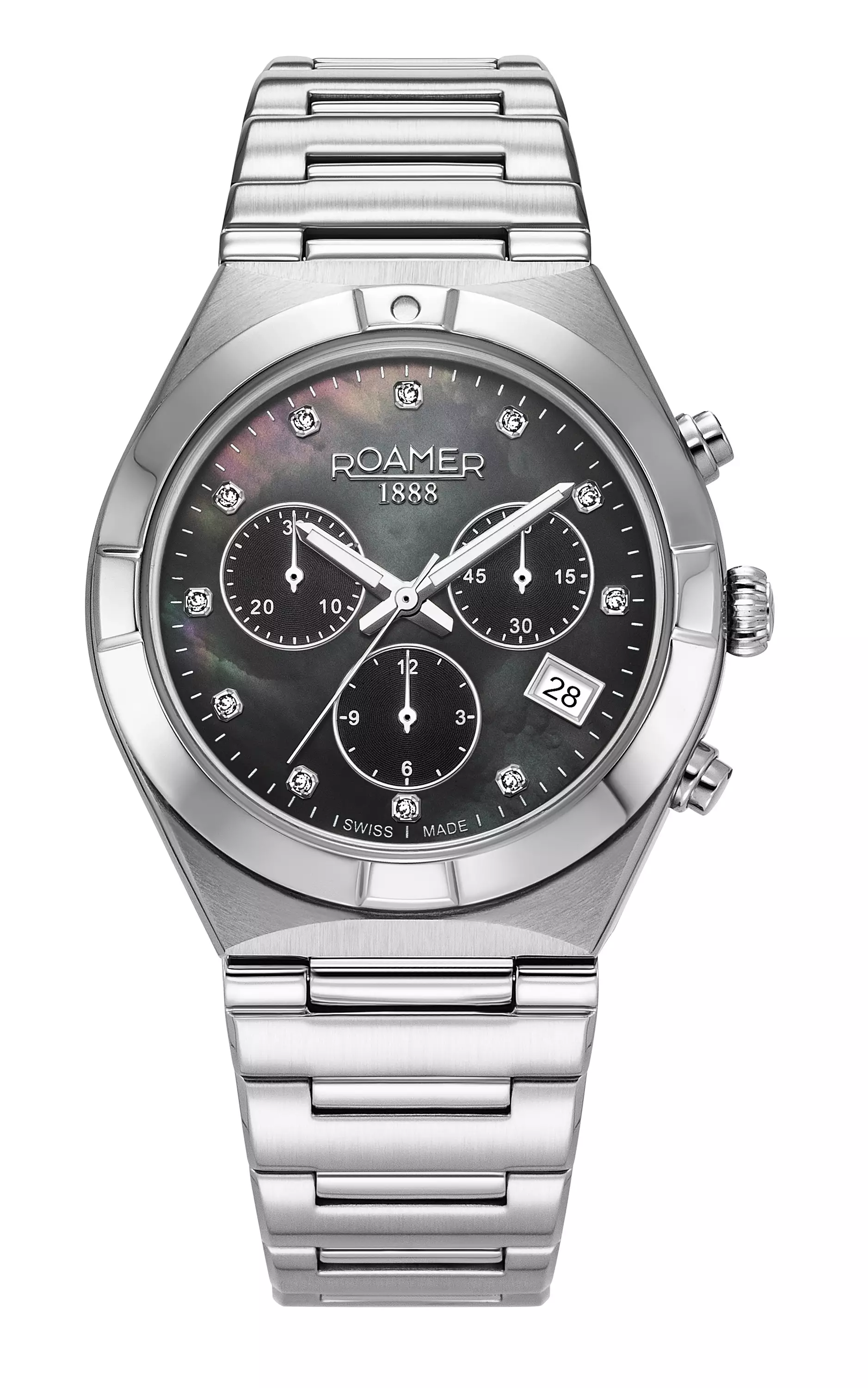 Roamer Of Switzerland - Eos Ladies Chrono -rannekello on täydellinen valinta nykypäivän naiselle! Sveitsiläisessä rannekellossa on kaunis helmiäskellotaulu, jonka kruunaa kirkkaat zirkonia-korukivet. Kellotaulun halkaisija on 38mm. Kellotaulua suojaa naarmuuntumaton safiirilasi. Kellolla on vesitiiveyttä 100 metriin asti.