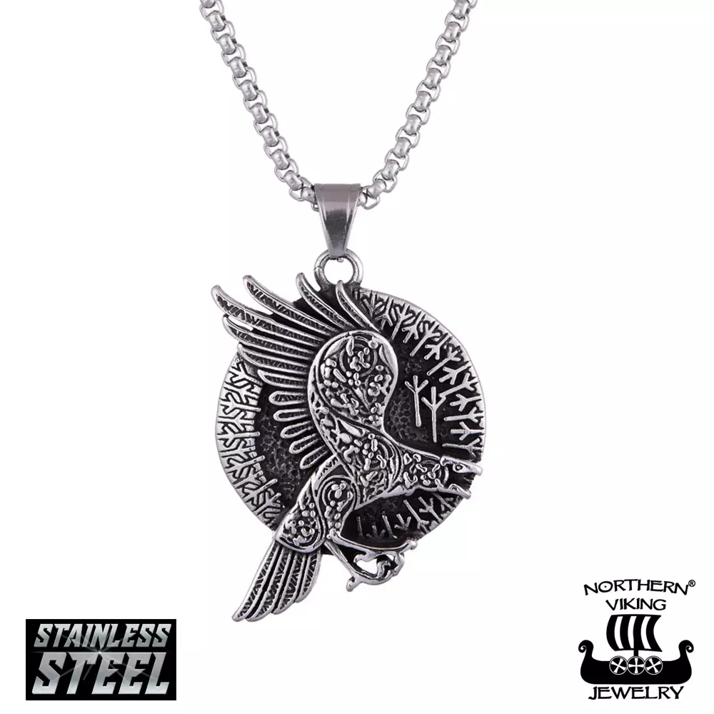 Northern Viking Jewelry®-Riipus "Flying Raven" Odinin korpit: Hänen uskollinen ratsunsa Sleipnir nukkuu. Hevosen kahdeksan jalkaa osoittavat kaikki eri ilmansuuntiin. Myös hän itse nukkuu valtaistuimellaan, rauhallisena kuin lapsi. Odin. Kun päivä kuluu ja pilvien varjot juoksevat kohti pimeää halki valtakunnan salien, avaa Odin yhtäkkiä ainoan silmänsä. Hän kuulee ne. Siiveniskujen kaiut voimistuvat kuin lumivyöryt Åsgardin tähtitaivaan alla. Odin puristaa koruaan ja tuntee sydämessään heidän läsnäolonsa: Hugin ja Munin, ajatus ja muisti, hänen aistinsa syvällä pimeänhatijoiden pajoissa ja korkealla jättien kuulaissa etäisyyksissä. Korpit lehahtavat tuulenpyörteinä valtaistuinsalin suurista ikkunoista, istuvat isäntänsä olkapäille ja kuiskivat tiedon hänen korviinsa. Odin sinetöi tiedon suutelemalla koruaan. Hän hymyilee. Hän tietää. Northern Viking Jewelry-riipus tyylikkäällä Rolo Link-ketjulla. Riipus sekä ketju on valmistettu kestävästä 316L Teräksestä. Riipuksen mitat: - Korkeus: 5,5 cm - Leveys: 3,9 cm - Paino: 35 g - Materiaali: 316L Kirurginteräs - Riipuksen lenkistä mahtuu 0,4 cm paksuinen ketju Ketjun mitat: - Paksuus 3 mm - Pituus 55cm Riipus ja ketju toimitetaan uniikissa Northern Viking Jewelry®-Juuttipussissa.