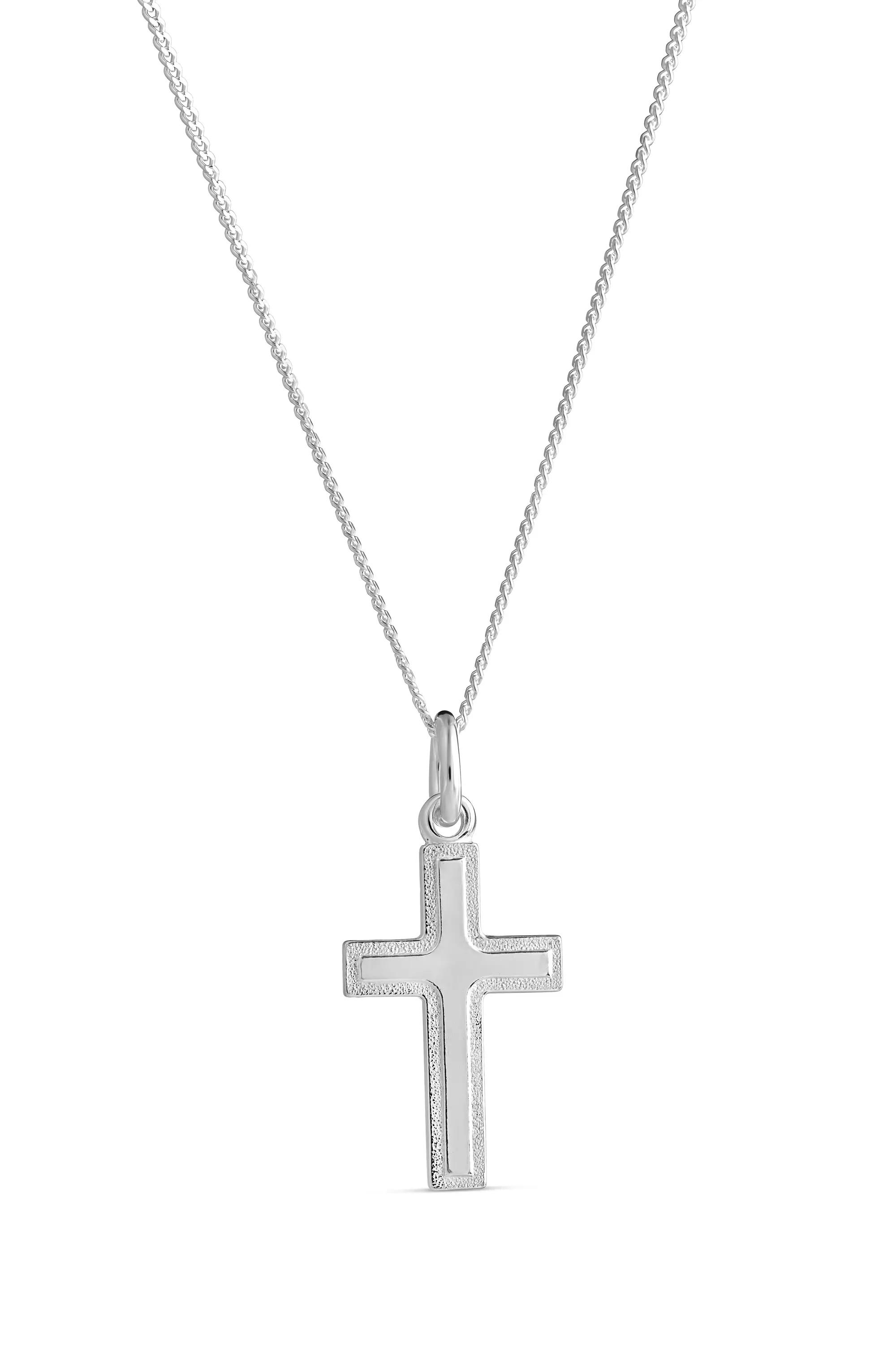 Kotimainen hopeinen ristiriipus, elämän tärkeitä hetkiä varten! 925 hopeasta valmistettu klassinen ristiriipus on yksinkertainen ja tyylikäs. Riipus roikkuu panssariketjussa. Riipuksen pituus: 19 x 10mm