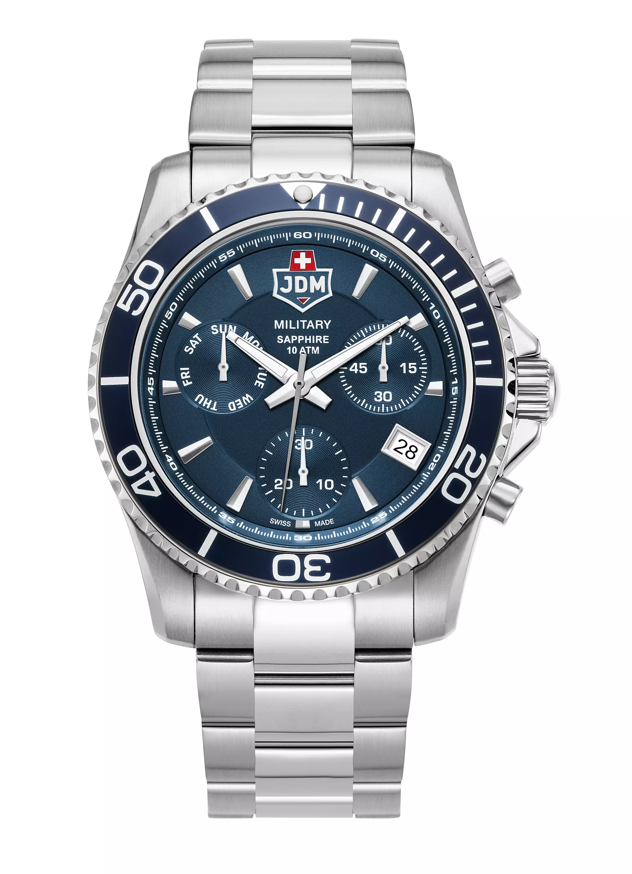 JDM-Military - Sveitsiläistä laatua ajattomassa muodossa. Sierra Chrono -rannekello on tyylikäs valinta niin arkeen kuin juhlaan. Laadukkaan rannekellon varustukseen kuuluu naarmuuntumaton safiirilasi, sekä 5 ATM roiskevesisuoja. Kellon runko on valmistettu ruostumattomasta teräksestä. Sveitsiläisillä JDM Military -kelloilla on aina valmistajan myöntämä 5. vuoden takuu.