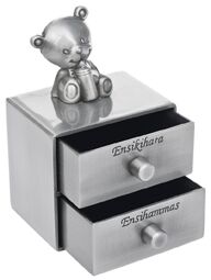 Tinattu kastelahja lipasto on upea muisto. Tähän pieneen lipastoon saat otettua talteen lapsen ensihampaan ja ensikiharan. Pienen klassisen lipaston päällä istuu suloinen nalle. Koko: 5x3,5x8cm