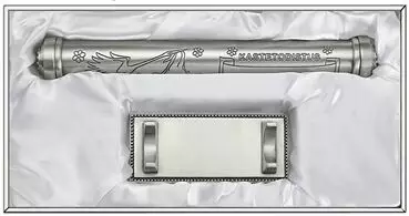 Kastetodistuputki jalustalla. Kastetodistusputken koko n. 24,5cm x 3,5cm, jalustan koko n.11,5cm x 5cm. Putkessa kaiverrustila nimelle. Tinattu.