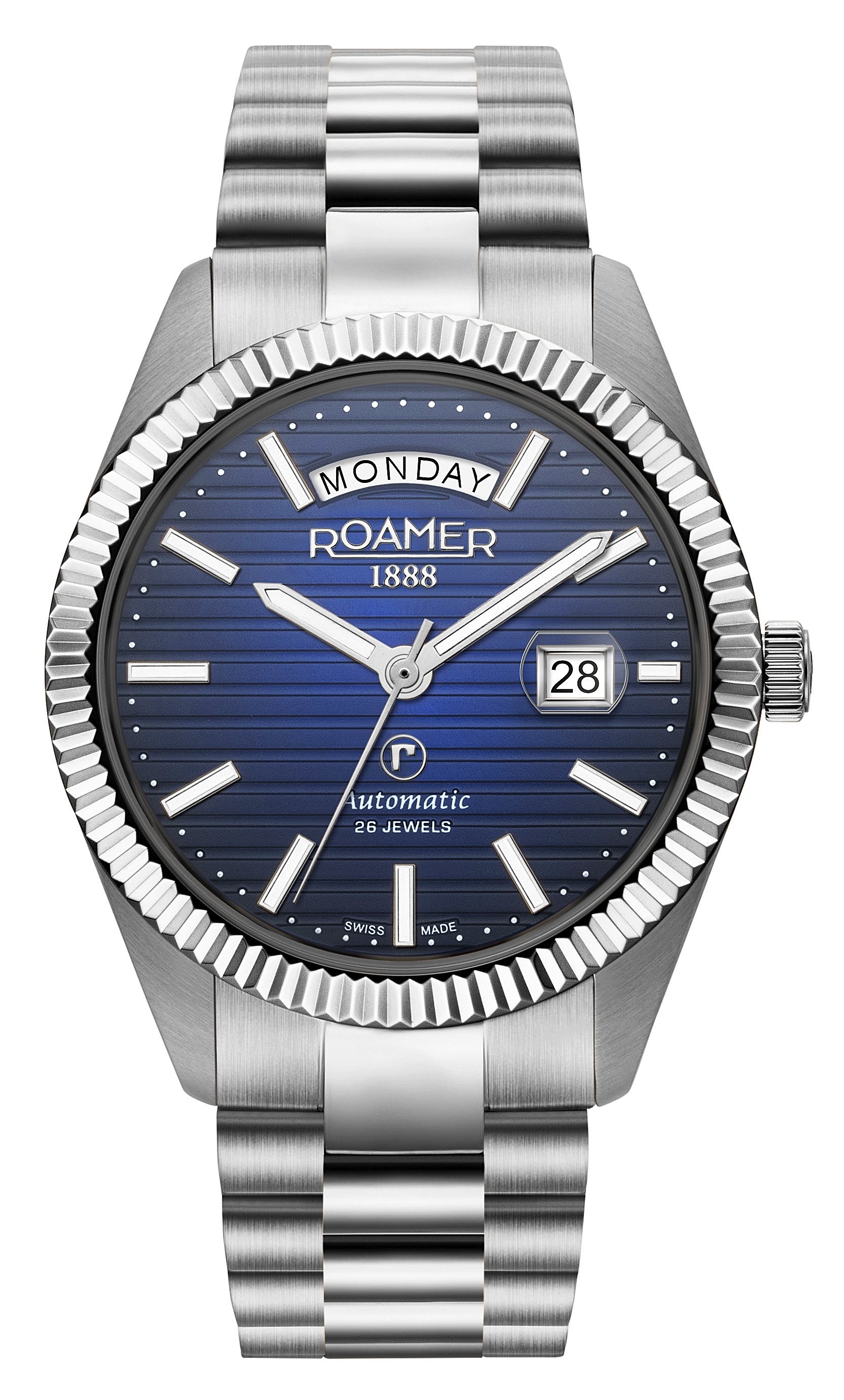 Roamer Of Switzerland - Primeline Daydate on oikea katseenvangitsija! Laadukkaan sveitsiläisen rannekellon varustukseen kuuluu naarmuuntumaton safiirilasi, automaattikoneisto, sekä vesitiiveys 50 metriin asti. Kellossa on myös käytännöllinen päivyri. Primeline on täydellinen valinta laatua arvostavalle!